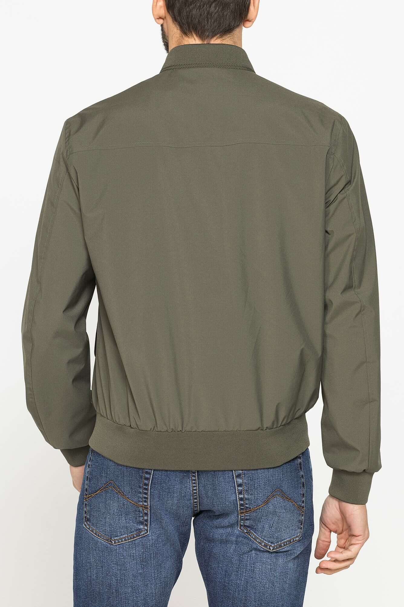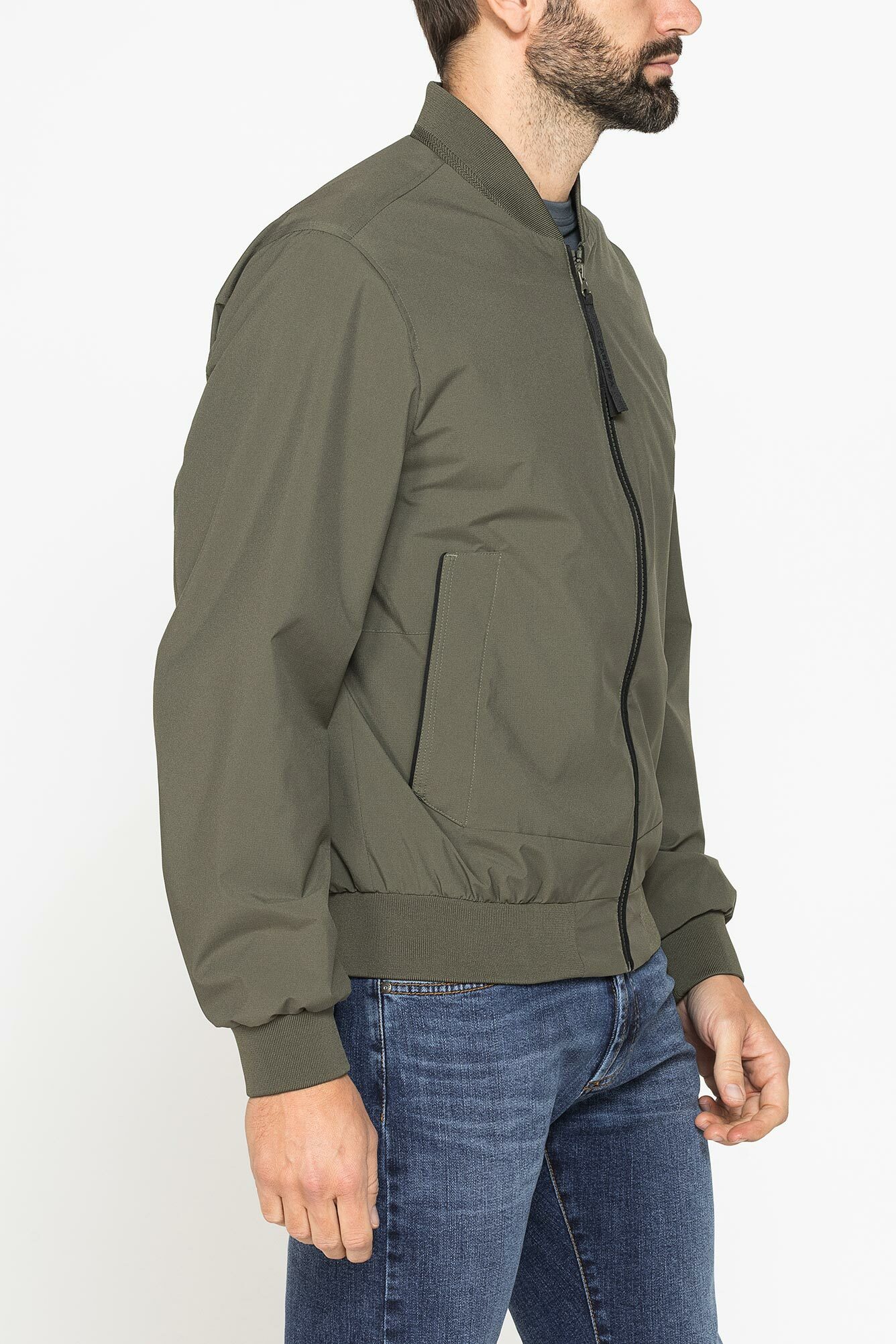 Áo khoác bomber nam với gấu tay, gấu áo và cổ áo có thun co giãn, túi hông có khóa bấm, lớp lót màu đen đồng bộ với khóa kéo, và một túi khóa kéo bên trong để đựng đồ có giá trị. Áo khoác ripstop được thiết kế cho thời tiết giao mùa.