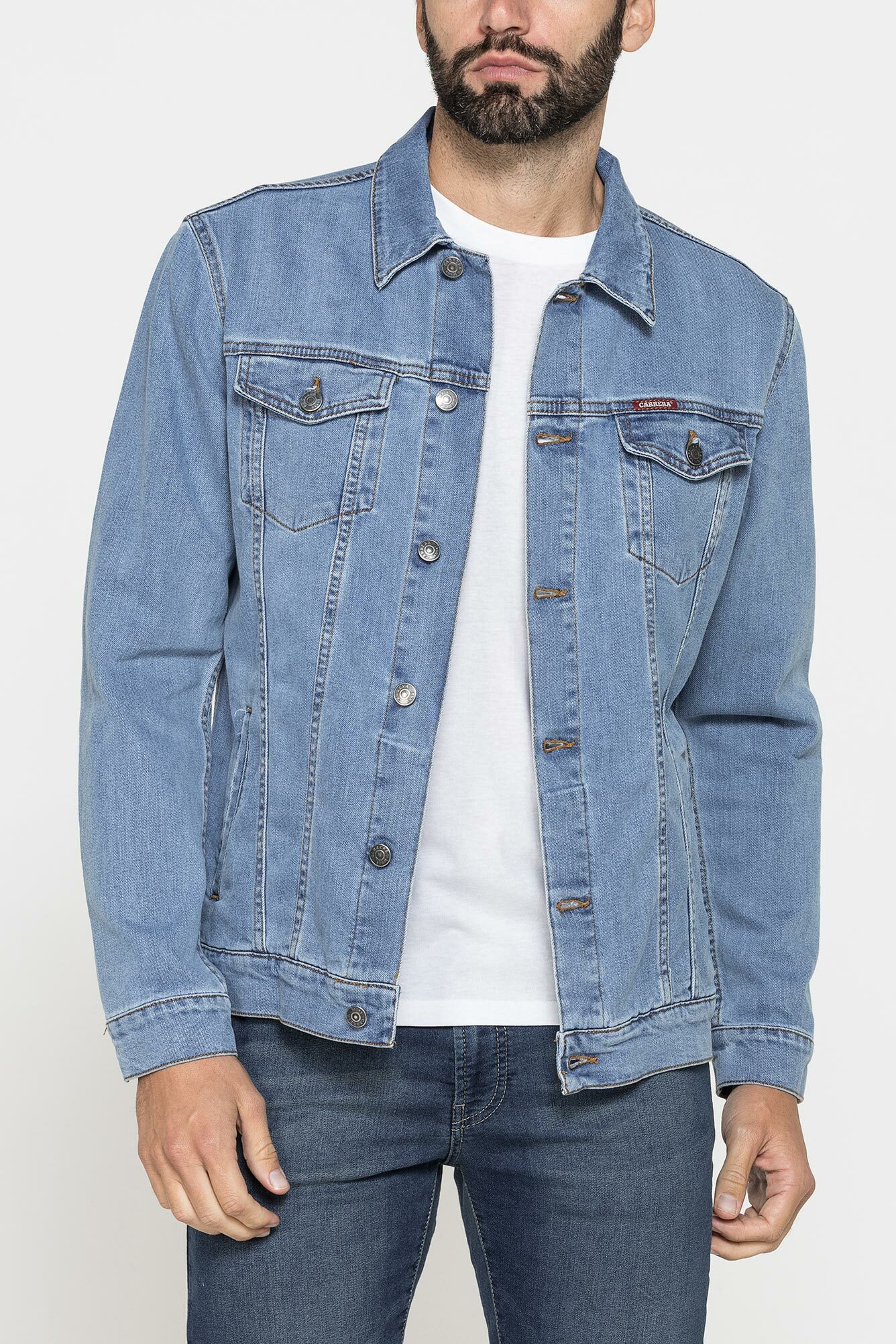 Áo khoác nam làm bằng vải jean co giãn 12,5 oz nhờ công nghệ “Spintech”. Mẫu có khóa trung tâm với các nút kim loại, cổ áo kiểu bán Pháp, túi trước có nắp và túi bên hông. Thương hiệu Carrera ở phía bên trái. Chiếc áo khoác denim cổ điển và vượt thời gian.
