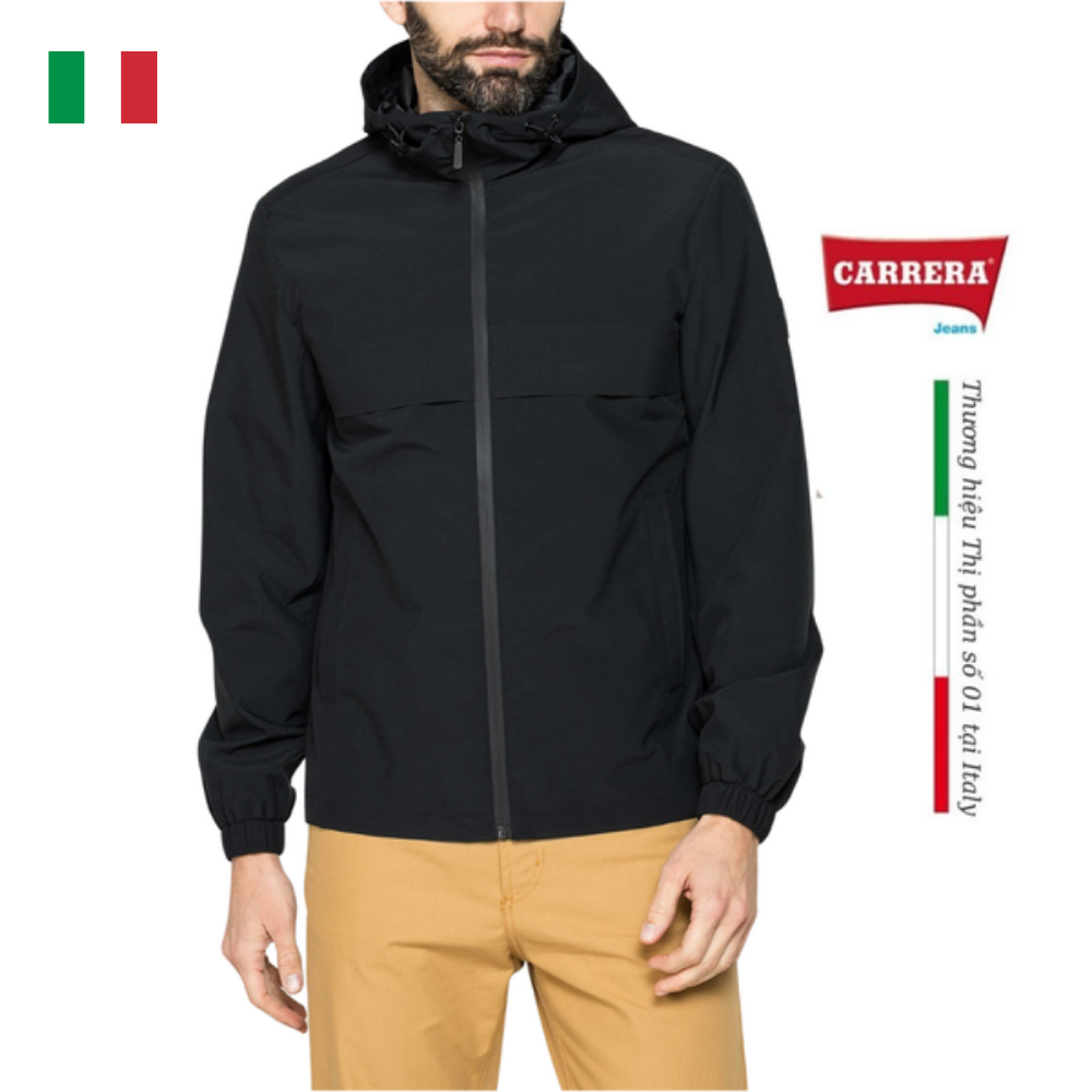 Áo khoác ngoài trời dành cho nam với kiểu dáng kỹ thuật và thể thao. Mẫu áo này có khóa kéo ở giữa với lớp phủ cao su lộ ra ngoài, mũ có thể điều chỉnh, hai túi ở phía trước, cổ tay áo bo chun. Logo thêu Carrera màu đen có họa tiết nổi màu đen ở tay áo bên trái.