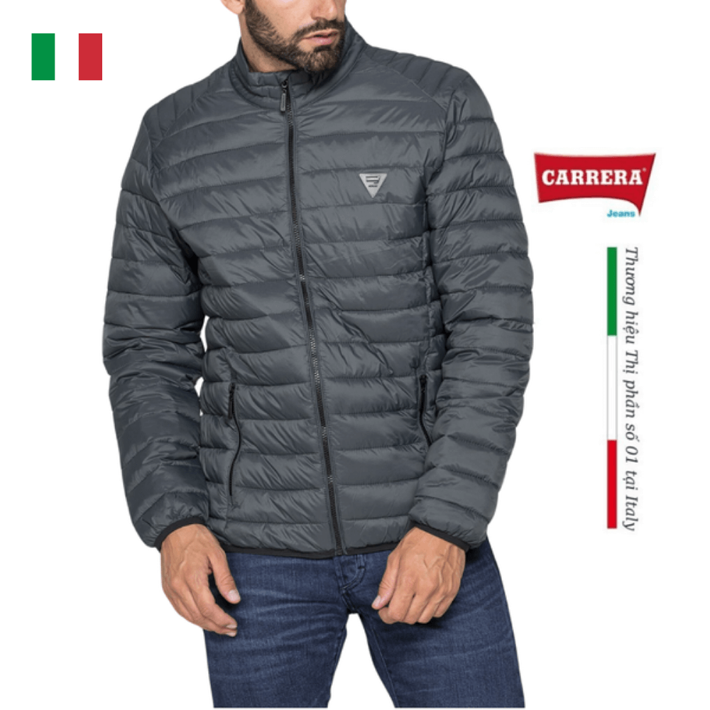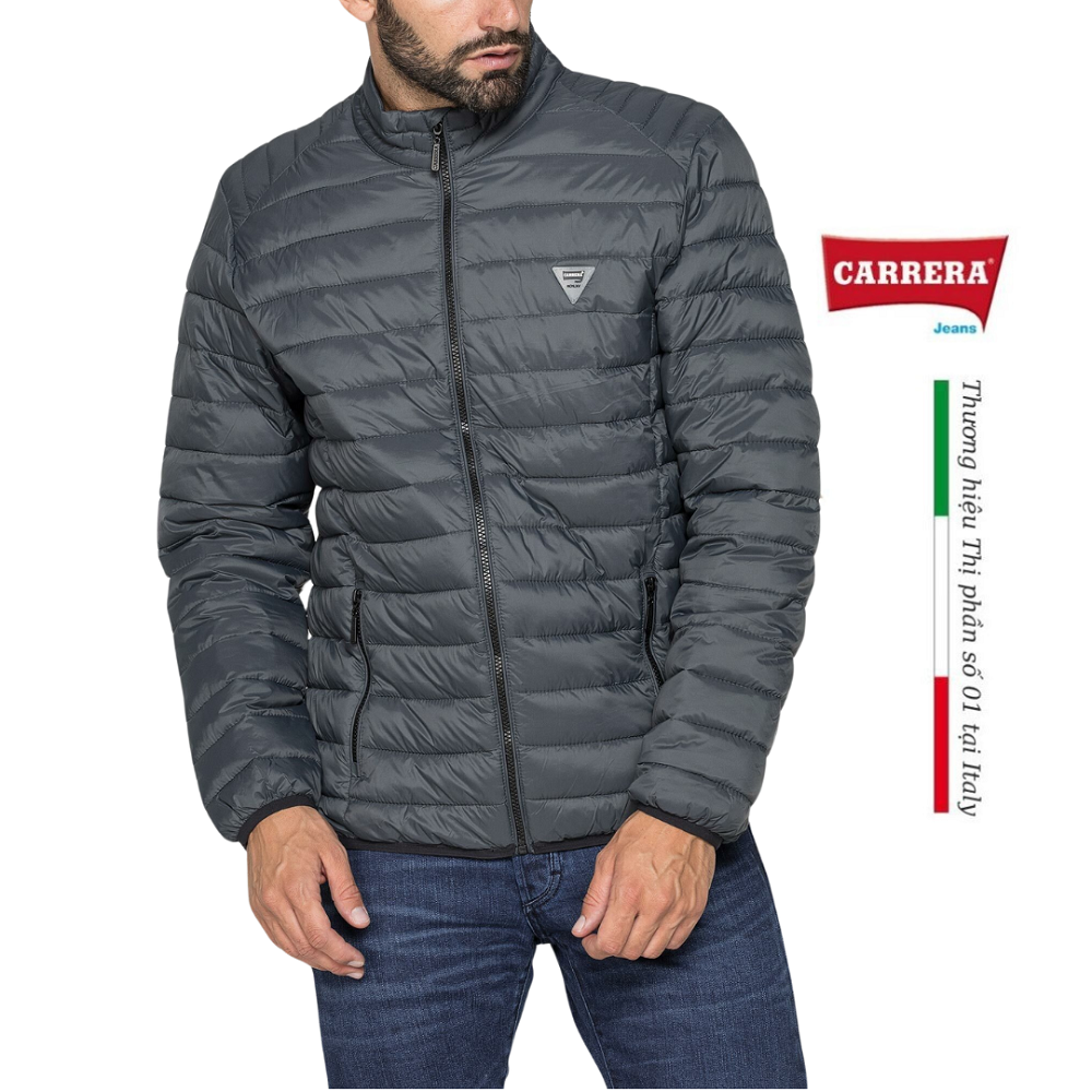 Áo khoác lông vũ nam dáng cổ điển, màu trơn với các điểm nhấn viền màu đen. Lớp ngoài được xử lý "chống nước" để chống lại mưa và gió vừa phải. Kiểu dáng có cổ đứng, khóa kéo ở giữa và túi bên hông có khóa kéo. Miếng dán logo Carrera trên ngực. Một mẫu áo cổ điển vượt thời gian.