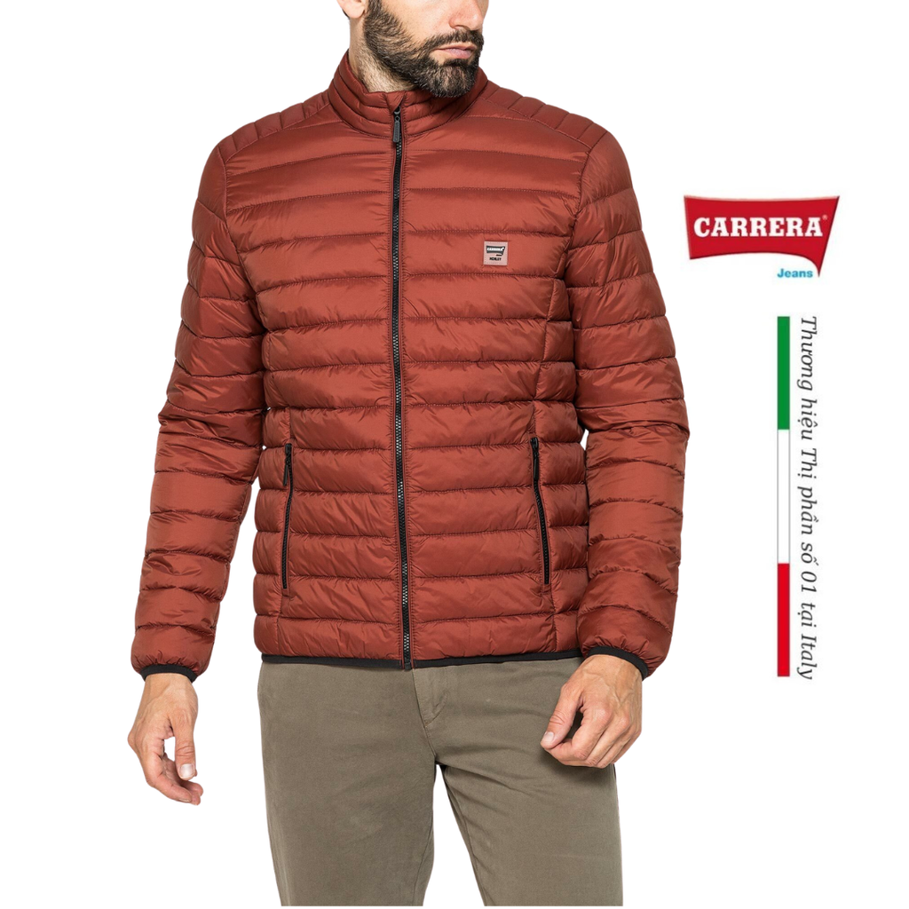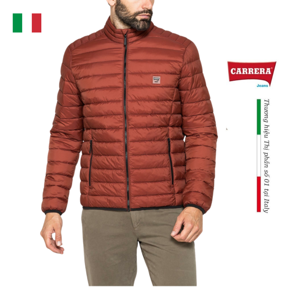 Áo khoác lông vũ nam dáng cổ điển, màu trơn với các điểm nhấn viền màu đen. Lớp ngoài được xử lý "chống nước" để chống lại mưa và gió vừa phải. Kiểu dáng có cổ đứng, khóa kéo ở giữa và túi bên hông có khóa kéo. Miếng dán logo Carrera trên ngực. Một mẫu áo cổ điển vượt thời gian.
