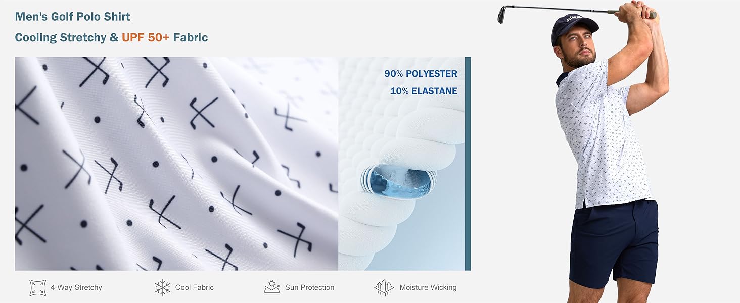 - Áo polo hiệu suất: Áo thun polo nam thoáng khí, nhẹ được làm từ chất liệu thấm hút mồ hôi và nhanh khô, giúp bạn luôn mát mẻ, không bị dính hay bí bách trong những tháng nóng bức ngoài trời. Chỉ số UPF 50+ bảo vệ bạn khỏi tia UV từ ánh nắng mặt trời. Sự kết hợp hoàn hảo cho sân golf hoặc bất kỳ môn thể thao ngoài trời nào.