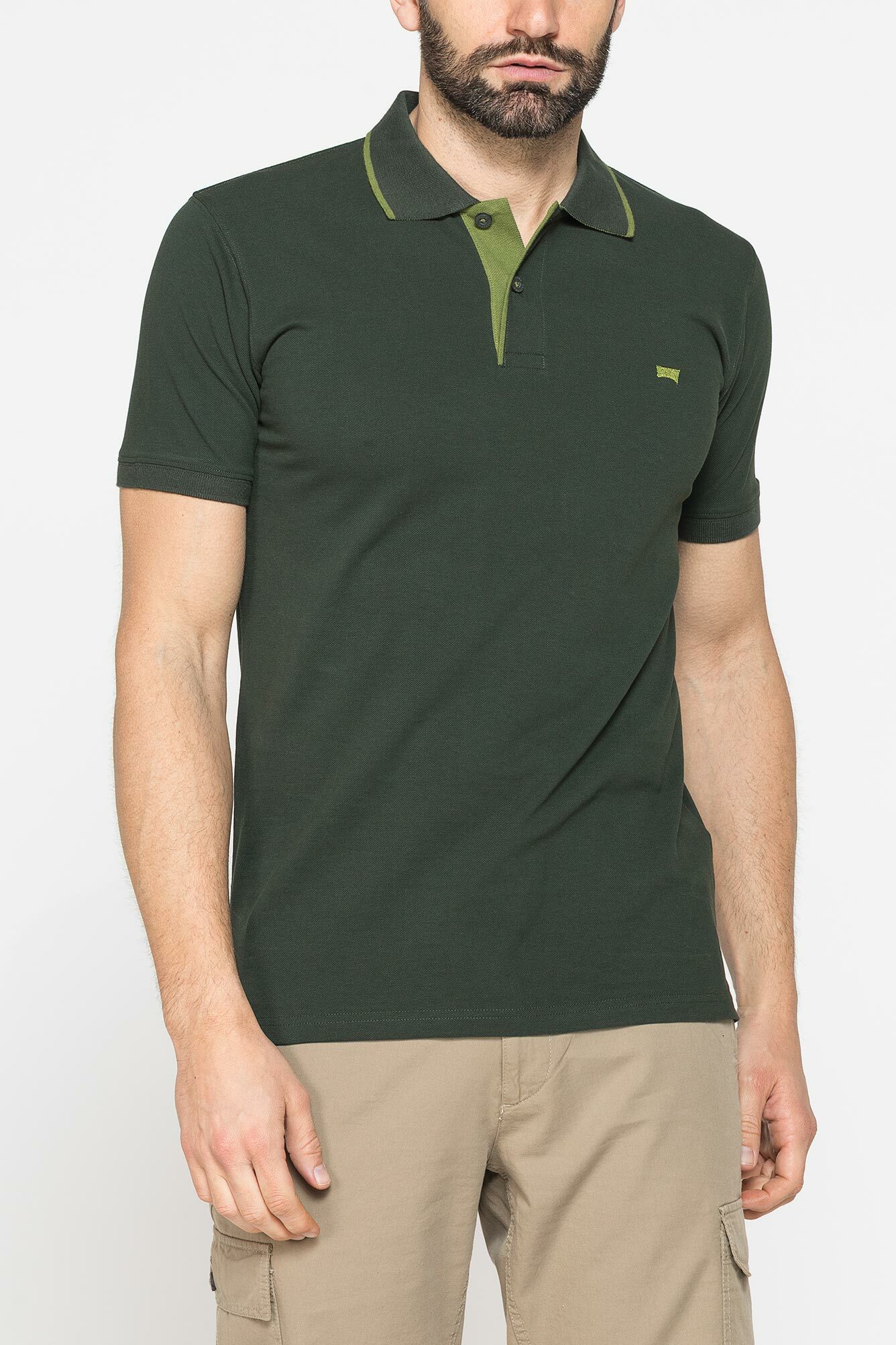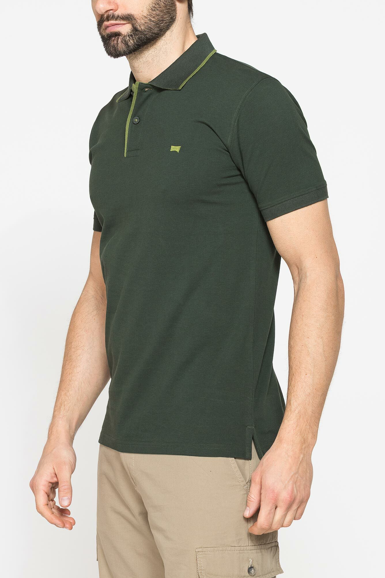 Áo polo ngắn tay nam có phom vừa vặn, được làm bằng vải piqué cotton nguyên chất. Logo thêu trên ngực ở phía bên trái. Cổ áo có viền gân và cổ tay áo có sọc họa tiết. Cổ áo 2 khuy. Các lỗ thoáng khí bên ở viền dưới cùng với nẹp viền. Một trang phục cần thiết với phong cách giản dị, cổ điển