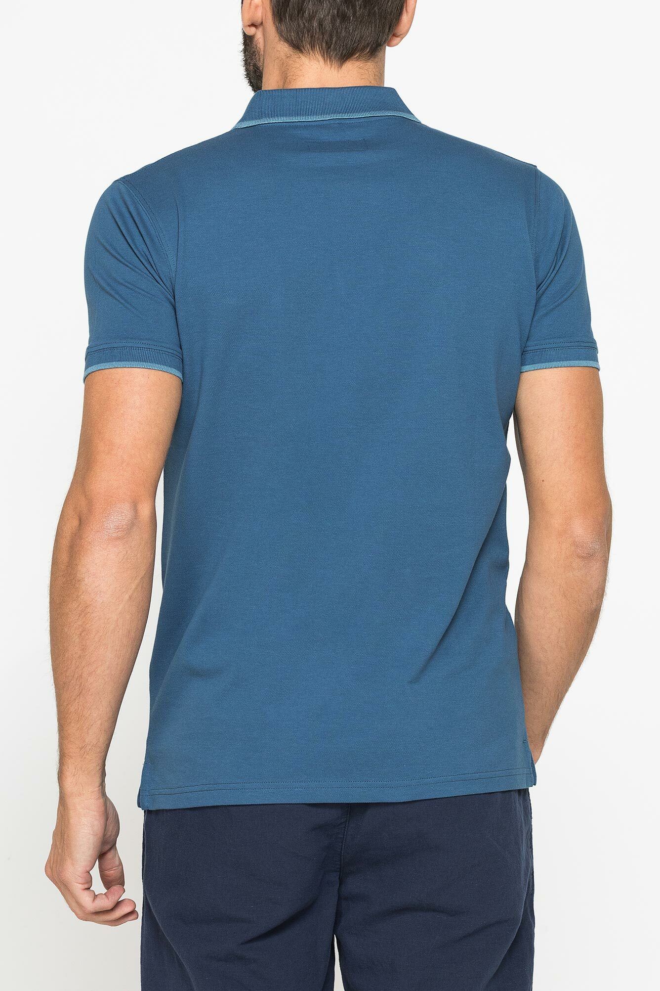 Áo polo ngắn tay nam có phom vừa vặn, được làm bằng vải piqué cotton nguyên chất. Logo thêu trên ngực ở phía bên trái. Cổ áo có viền gân và cổ tay áo có sọc họa tiết. Cổ áo 2 khuy. Các lỗ thoáng khí bên ở viền dưới cùng với nẹp viền. Một trang phục cần thiết với phong cách giản dị, cổ điển