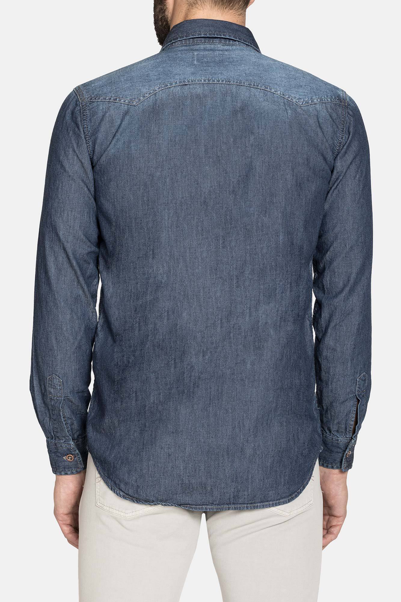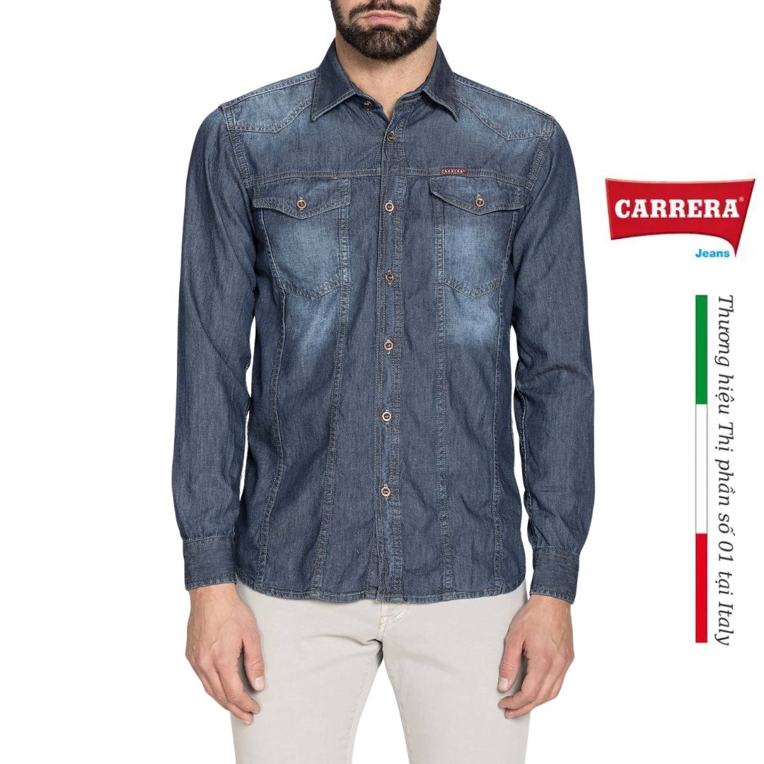 Áo sơ mi dài tay. Được làm từ denim cotton nguyên chất nhẹ 7oz. Khóa trung tâm với các nút Carrera được cá nhân hóa và các nút trên tay áo. Túi ngực có nắp.