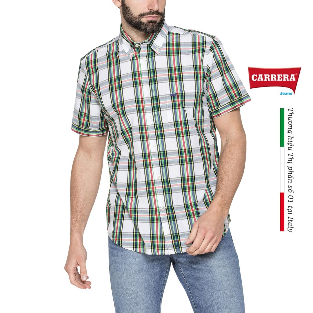Áo sơ mi tay lỡ với kiểu dáng vừa vặn và cổ điển. Mẫu có cổ áo cài khuy và nẹp viền. Túi bên ngực thêu logo Carrera. Được làm từ chất liệu cotton nhuộm sợi chất lượng với nhiều hoa văn khác nhau, trang phục phù hợp với mọi lứa tuổi