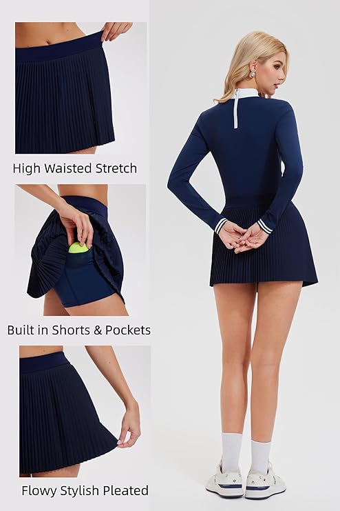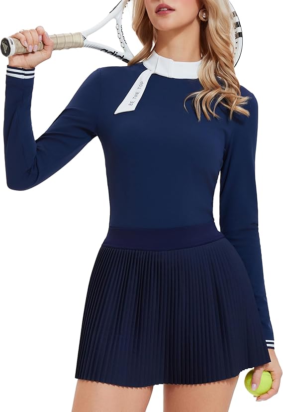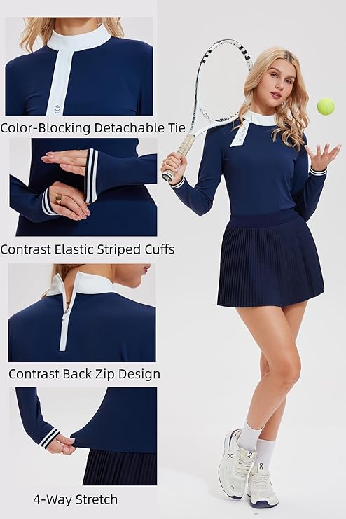 - Bộ đồ thể thao hai mảnh thời trang với áo tương phản: Bộ đồ tennis nữ gồm áo dài tay với các chi tiết màu tương phản nổi bật (cổ áo, tay áo) kết hợp với chân váy xếp ly cạp cao thanh lịch, lý tưởng cho các hoạt động tennis, chơi golf, chơi pickleball và ngoài trời.