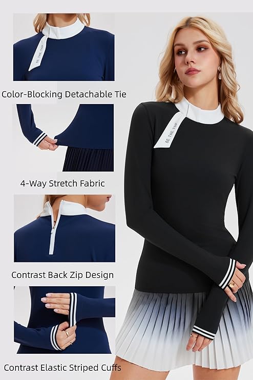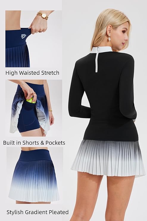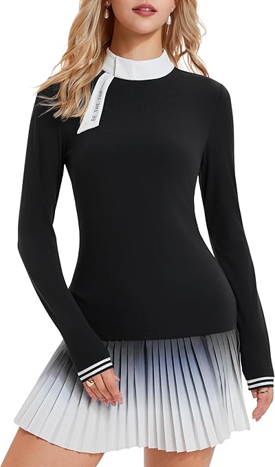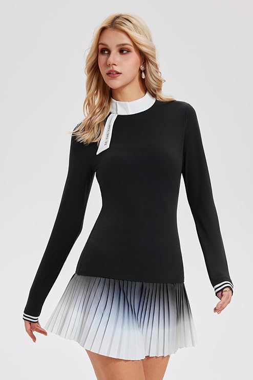 - Bộ đồ thể thao hai mảnh thời trang với áo tương phản: Bộ đồ tennis nữ gồm áo dài tay với các chi tiết màu tương phản nổi bật (cổ áo, tay áo) kết hợp với chân váy xếp ly cạp cao thanh lịch, lý tưởng cho các hoạt động tennis, chơi golf, chơi pickleball và ngoài trời.