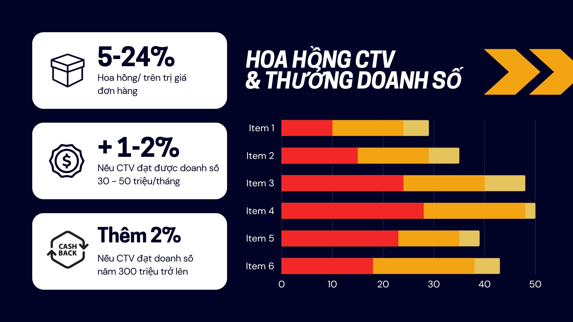 >> CTV sẽ được thưởng thêm 2% nếu doanh số đạt 50 triệu/tháng cho tất cả các mặt hàng trừ doanh thu các mặt hàng có tag "Thanh lý"..