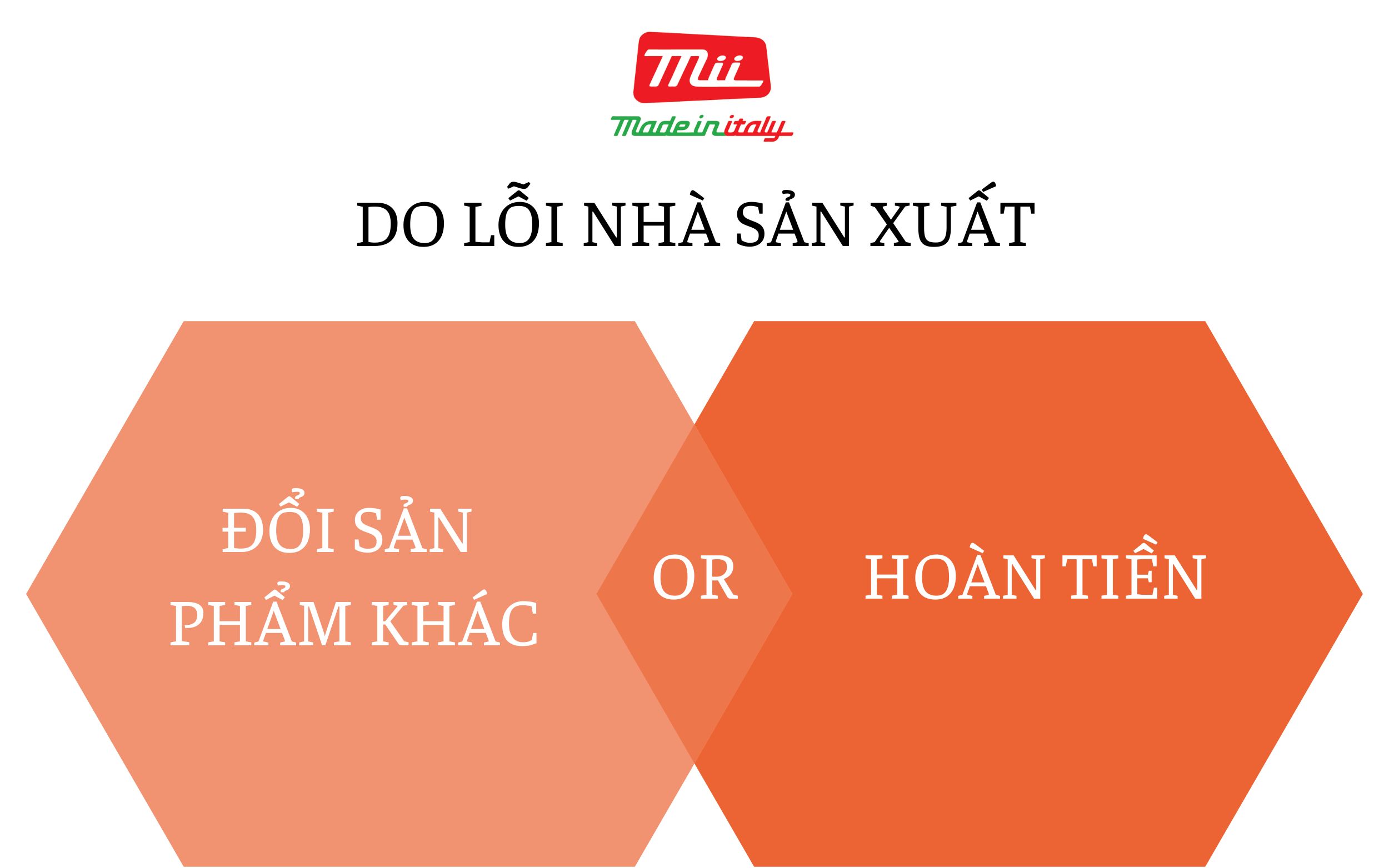- Quý khách vui lòng download và điền đầy đủ thông tin trên PHIẾU ĐỔI TRẢ SẢN PHẨM được đăng trên wesite https://madein-italy.com.vn/ , sau đó gửi về email heliostrading2022@gmail.com kèm với hỉnh ảnh, video sản phẩm bị lỗi. Hoặc trao đổi trực tiếp với nhân viên tư vấn thông qua các kênh truyền thông của Mii hoặc hotline công ty. Mii sẽ liên hệ lại để xác nhận trước khi Quý khách đóng gói sản phẩm gửi về trung tâm Mii;