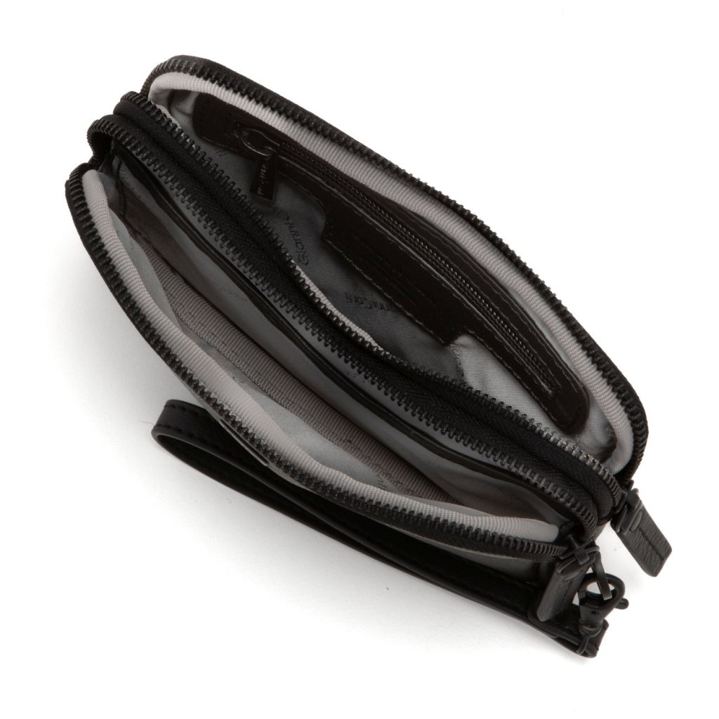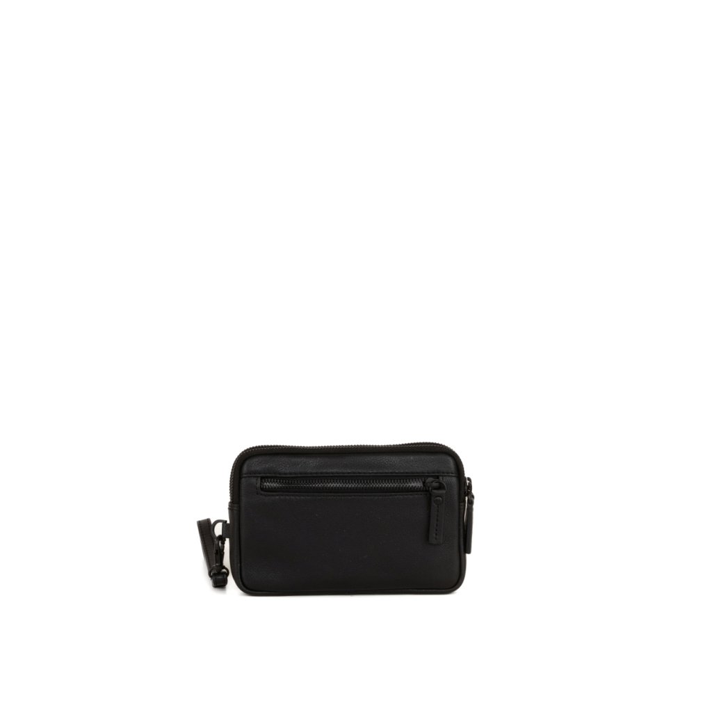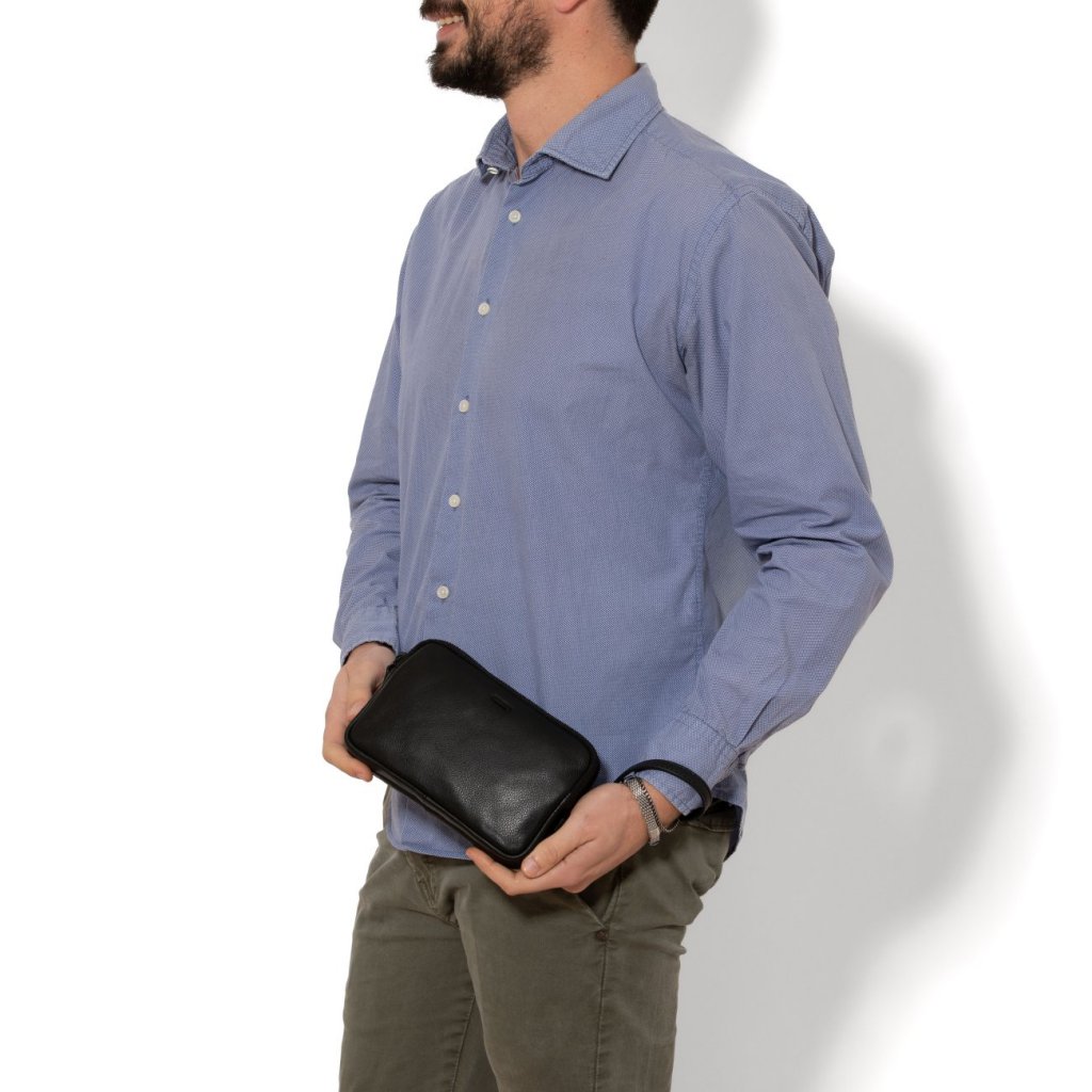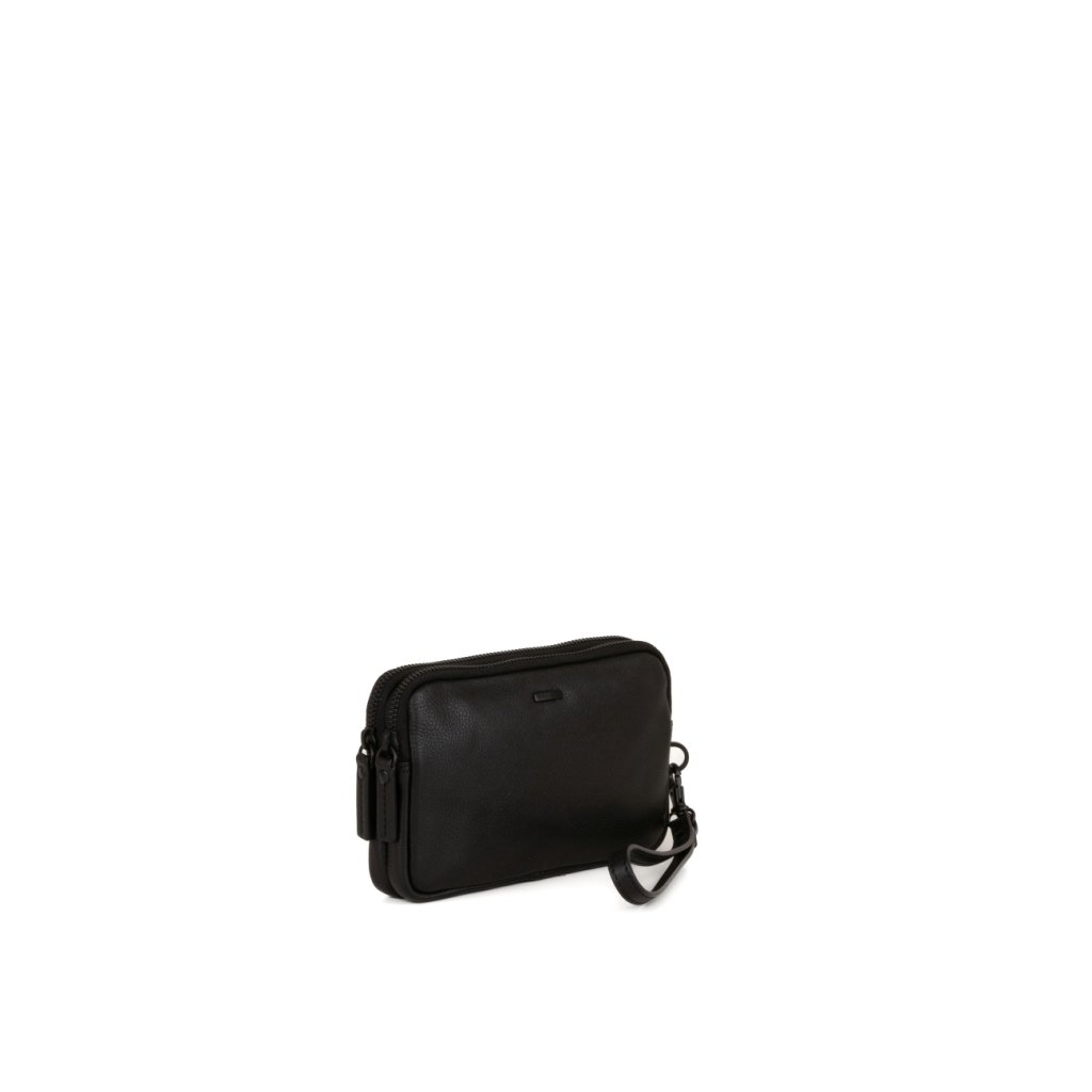 - Clutch cầm tay bằng da thật, màu đen.