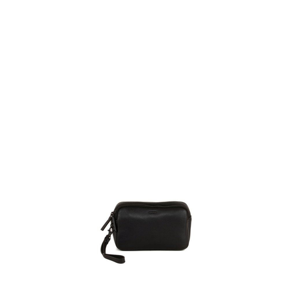 - Clutch cầm tay bằng da thật, màu đen.