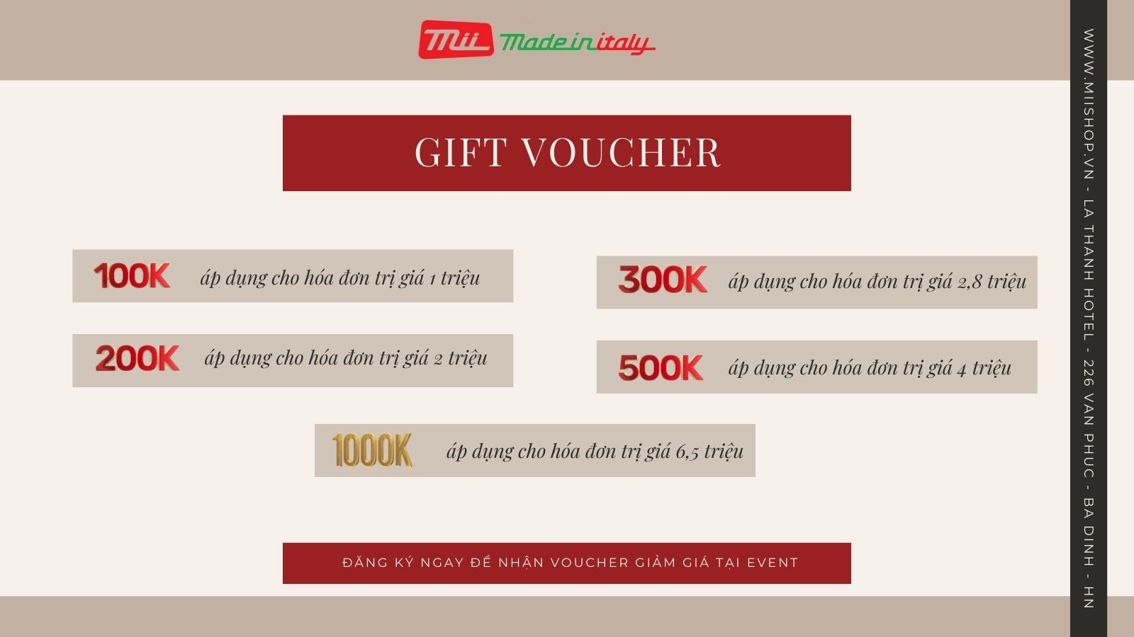 Để tri ân sự ủng hộ của quý khách, Mii Mua Sắm xin gửi tặng voucher trị giá lên đến 1 triệu đồng cho mỗi hóa đơn mua sắm trong 3 ngày diễn ra sự kiện (chi tiết xem ảnh bên dưới) . Hãy nhanh chân đến gian hàng của chúng tôi để nhận ưu đãi này. Quý khách chỉ việc show ra hình ảnh chụp bài post trên tường của fanpage hoặc trang cá nhân của tôi để nhận được Quà tặng độc quyền này!