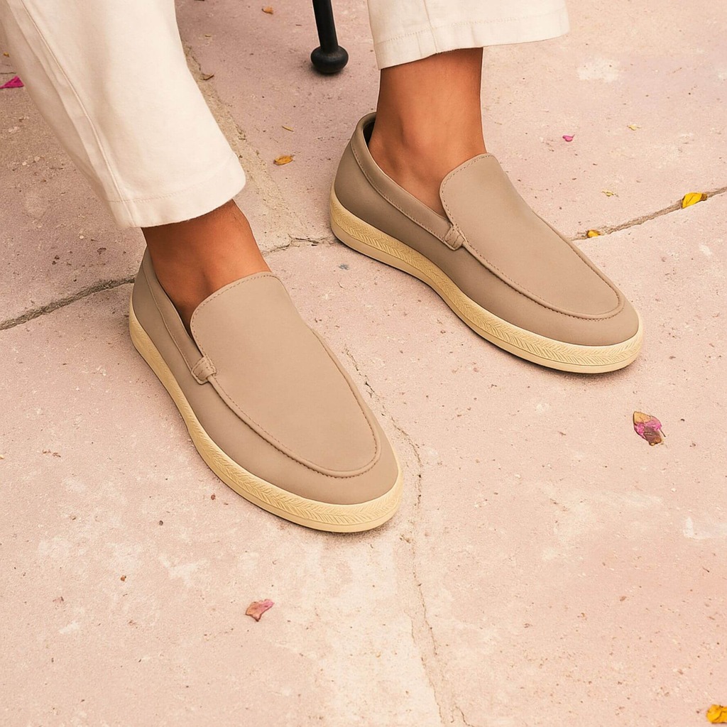 Giày Espadrilles mùa hè dành cho nam bằng da lộn màu be với đế đan dây. Phong cách giản dị, nhẹ nhàng và thoáng khí. Hoàn hảo cho cả đi chơi và đi nghỉ.