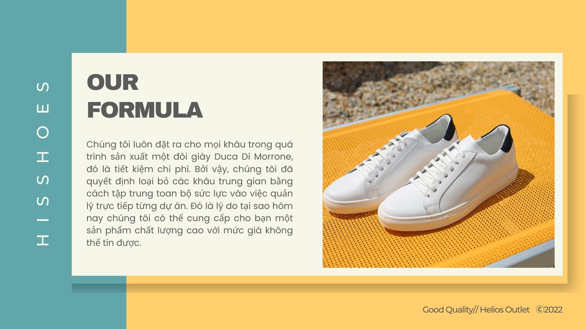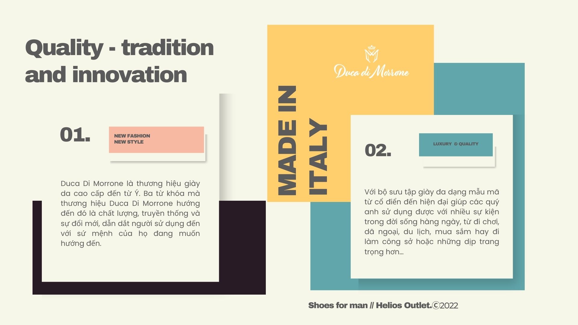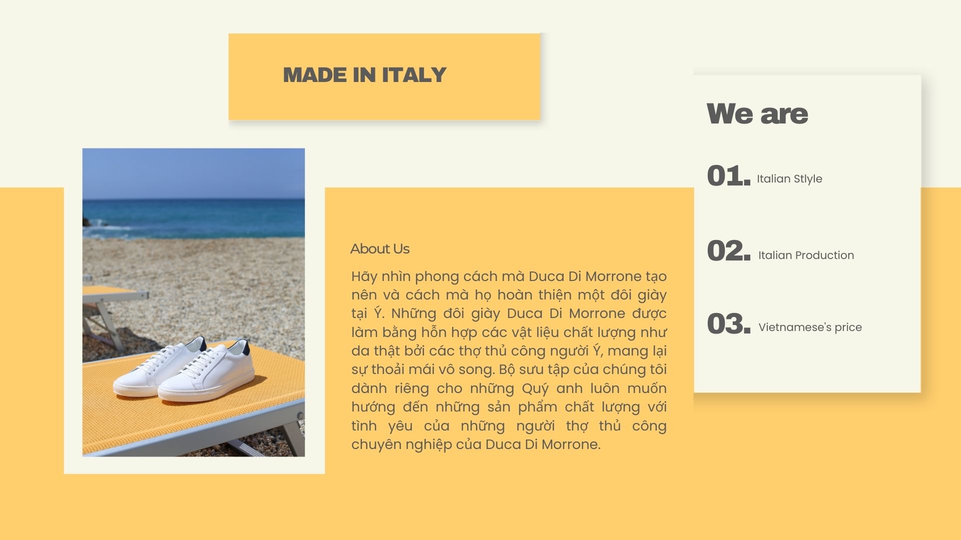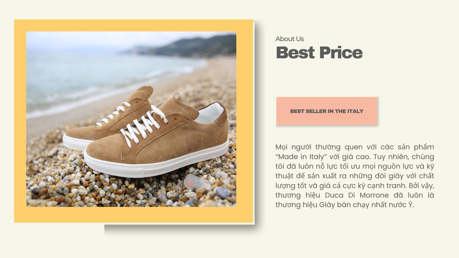 Mọi người thường quen với các sản phẩm “Made in Italy” với giá cao. Tuy nhiên, chúng tôi đã luôn nỗ lực tối ưu mọi nguồn lực và kỹ thuật, loại bỏ tất cả khâu trung gian bằng cách tập trung toàn bộ sức lực vào việc quản lý từng giai đoạn của dự án để sản xuất ra những đôi giày với chất lượng cao và giá cả không thể tin được. Bởi vậy, thương hiệu Duca Di Morrone đã luôn là thương hiệu Giày bán chạy nhất nước Ý.