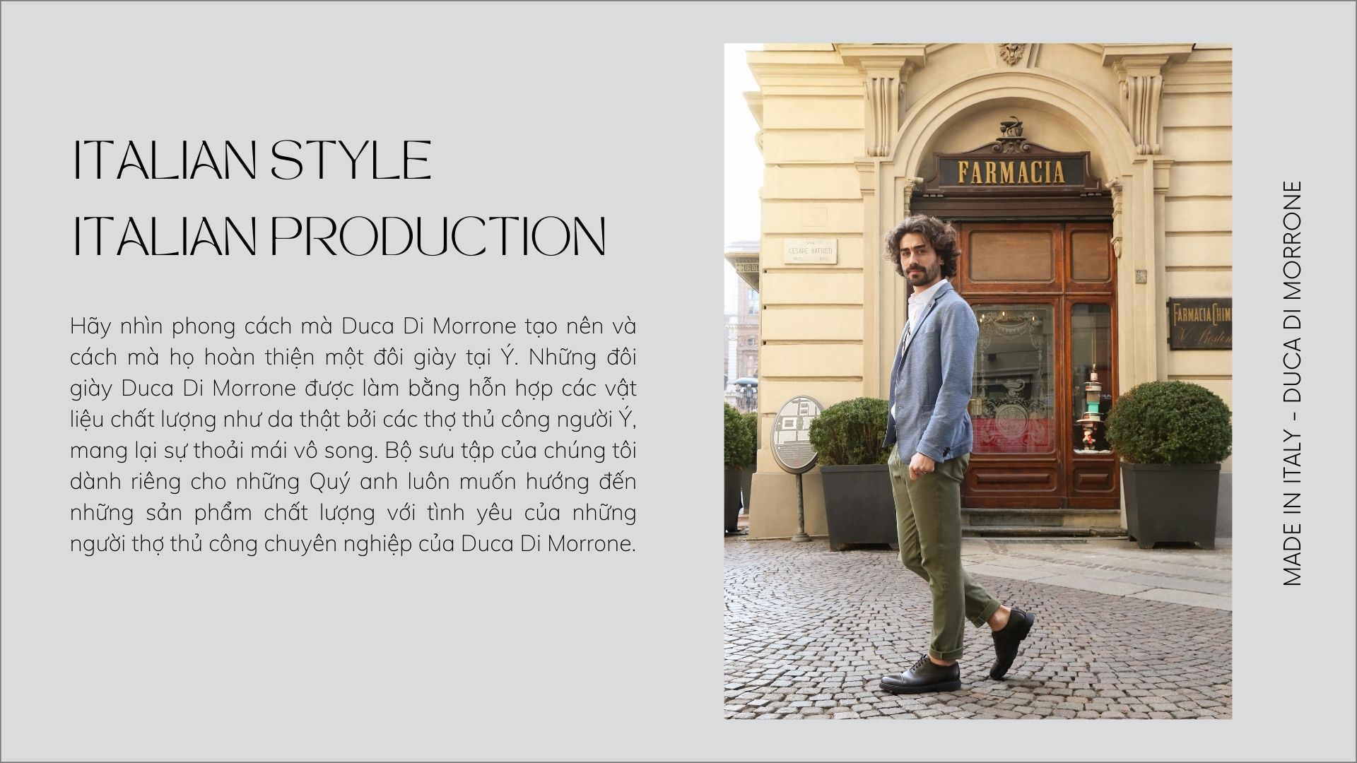 Hãy nhìn phong cách mà Duca Di Morrone tạo nên và cách mà họ hoàn thiện một đôi giày tại Ý. Những đôi giày Duca Di Morrone được làm bằng hỗn hợp các vật liệu chất lượng là da thật bởi các thợ thủ công người Ý, mang lại sự thoải mái vô song. Bộ sưu tập của chúng tôi dành riêng cho những Quý anh luôn muốn hướng đến những sản phẩm chất lượng với tình yêu của những người thợ thủ công chuyên nghiệp của Duca Di Morrone.