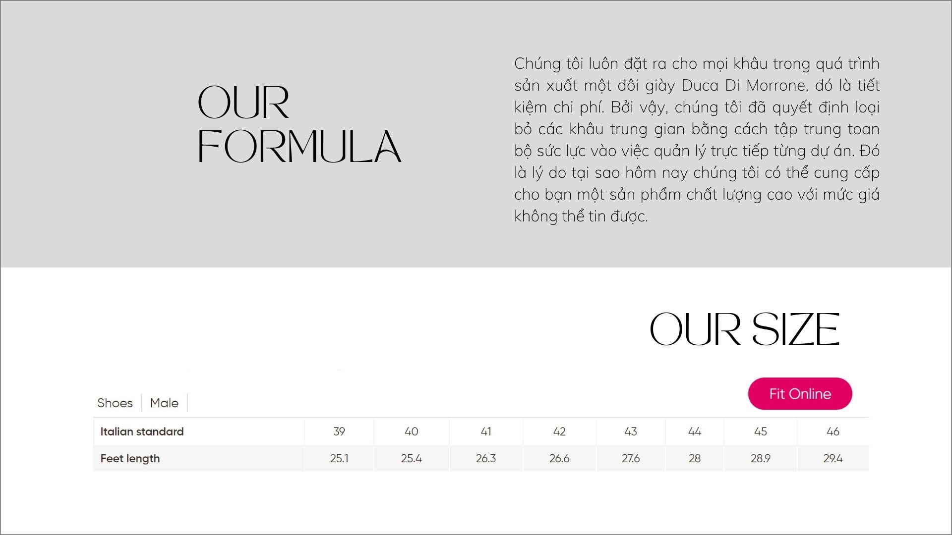 Mọi người thường quen với các sản phẩm “Made in Italy” với giá cao. Tuy nhiên, chúng tôi đã luôn nỗ lực tối ưu mọi nguồn lực và kỹ thuật, loại bỏ tất cả khâu trung gian bằng cách tập trung toàn bộ sức lực vào việc quản lý từng giai đoạn của dự án để sản xuất ra những đôi giày với chất lượng cao và giá cả không thể tin được. Bởi vậy, thương hiệu Duca Di Morrone đã luôn là thương hiệu Giày bán chạy nhất nước Ý.