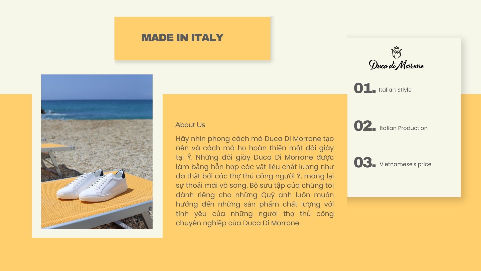 Mọi người thường quen với các sản phẩm “Made in Italy” với giá cao. Tuy nhiên, chúng tôi đã luôn nỗ lực tối ưu mọi nguồn lực và kỹ thuật, loại bỏ tất cả khâu trung gian bằng cách tập trung toàn bộ sức lực vào việc quản lý từng giai đoạn của dự án để sản xuất ra những đôi giày với chất lượng cao và giá cả không thể tin được. Bởi vậy, thương hiệu Duca Di Morrone đã luôn là thương hiệu Giày bán chạy nhất nước Ý.