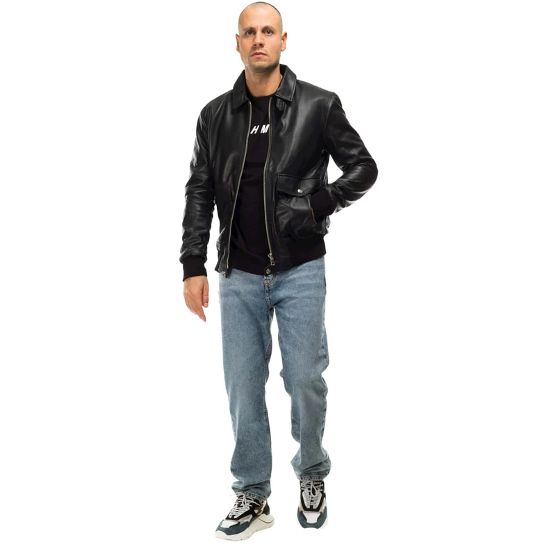 - Áo khoác bomber da cừu thật thủ công Ý cho nam, màu đen, size từ S đến 2XL