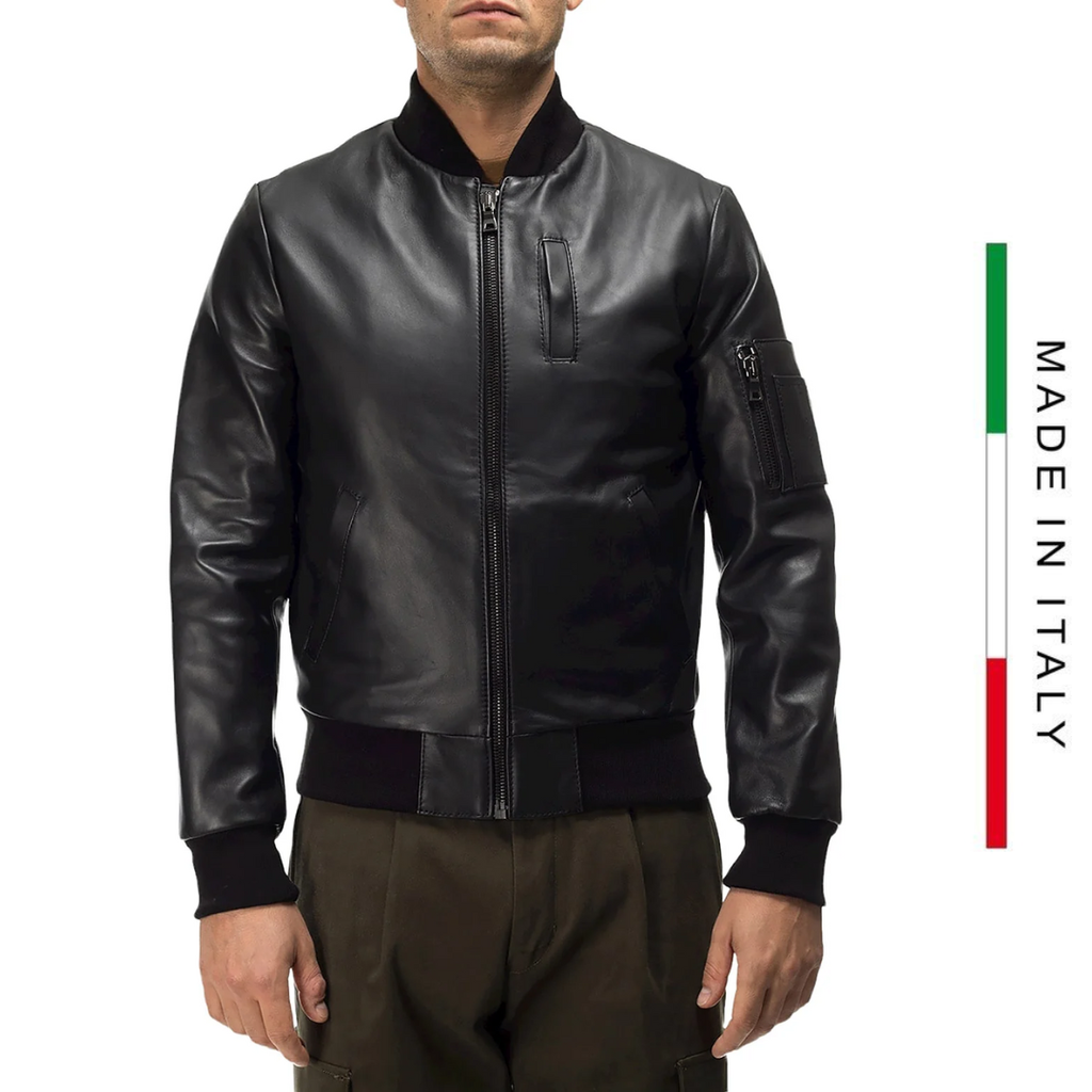 - Áo khoác bomber da cừu thật thủ công Ý cho nam, màu đen, size 2XS đến 2XL