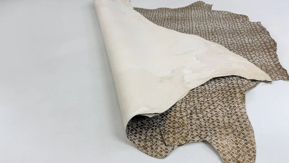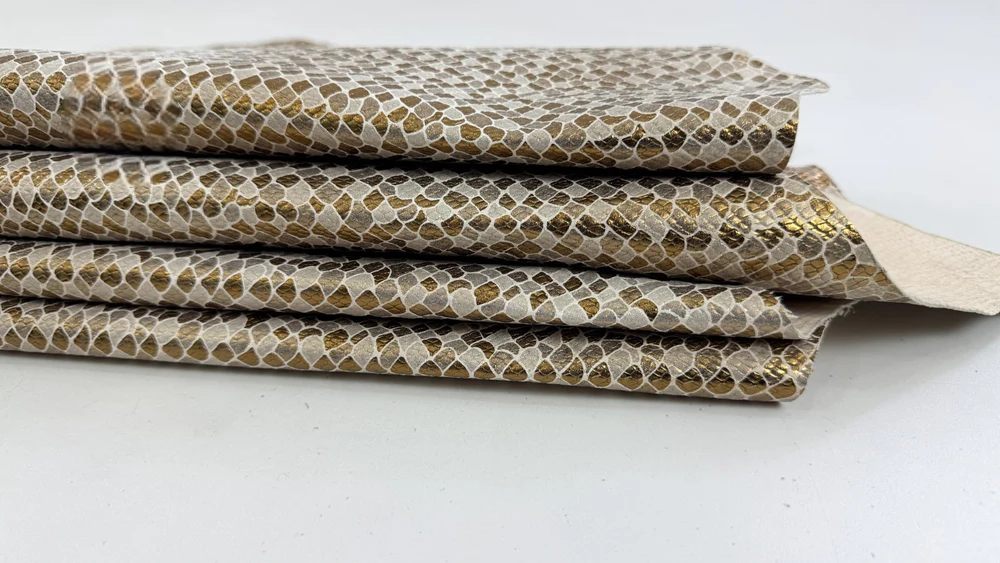 MÀU SẮC: Vàng đồng ánh kim, họa tiết da rắn mài mòn trên da bê.