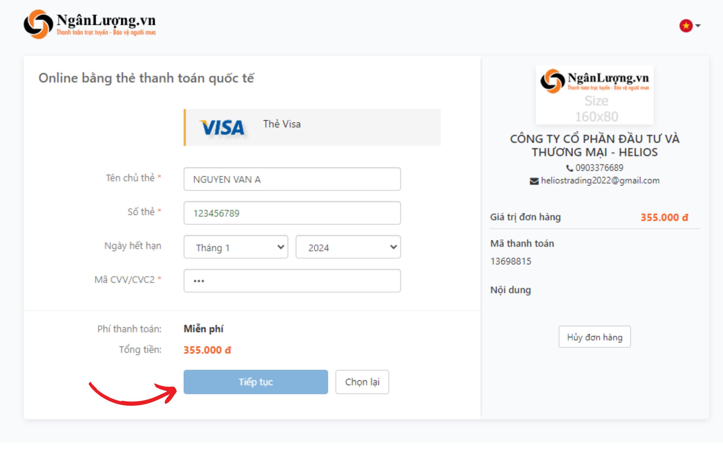 - Ví dụ quý khách lựa chọn thanh toán qua hình thức thẻ Visa của ngân hàng, quý khách click vào biểu tượng Visa trên màn hình, rồi điền các thông tin yêu cầu, sau đó nhấn nút "Tiếp tục".