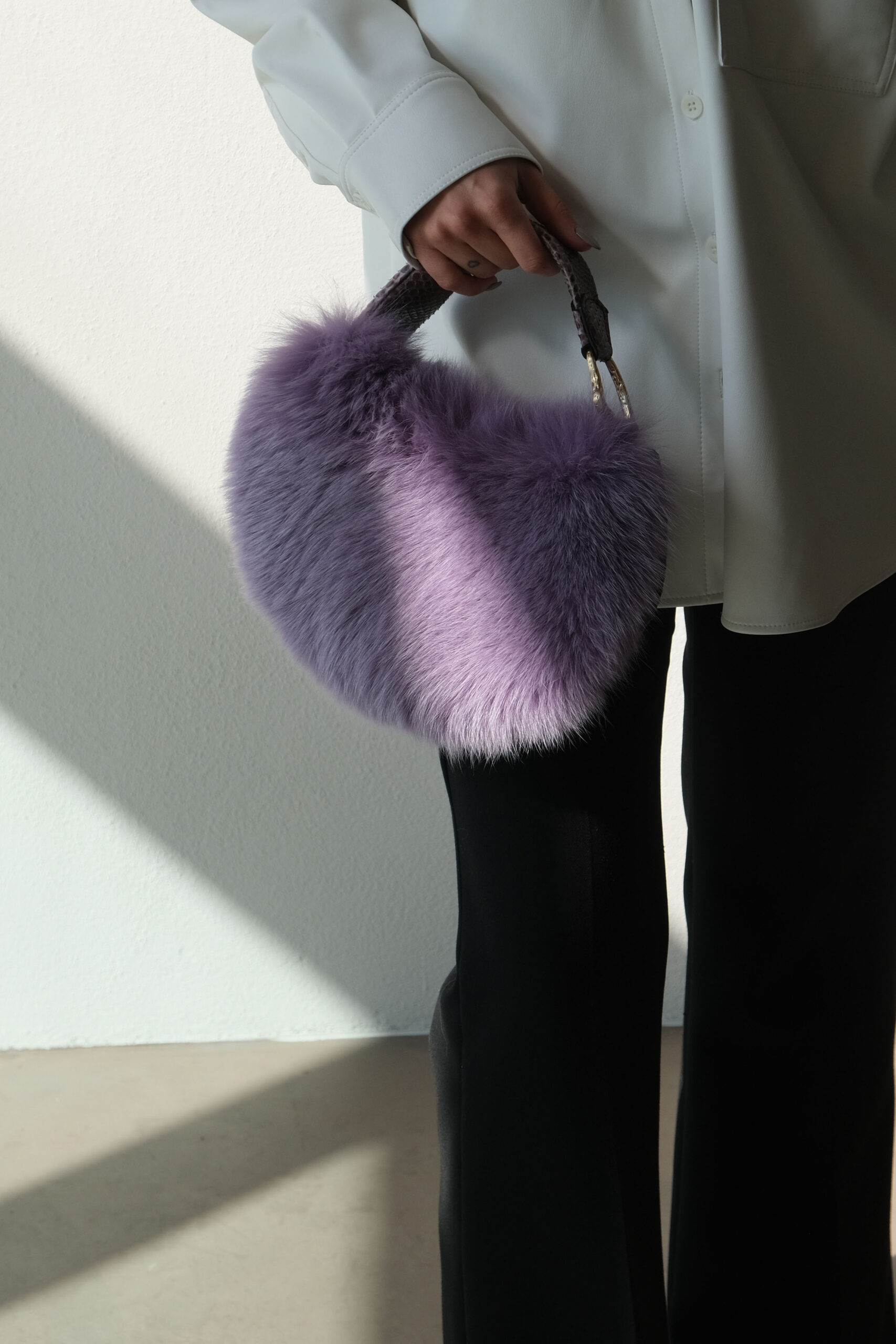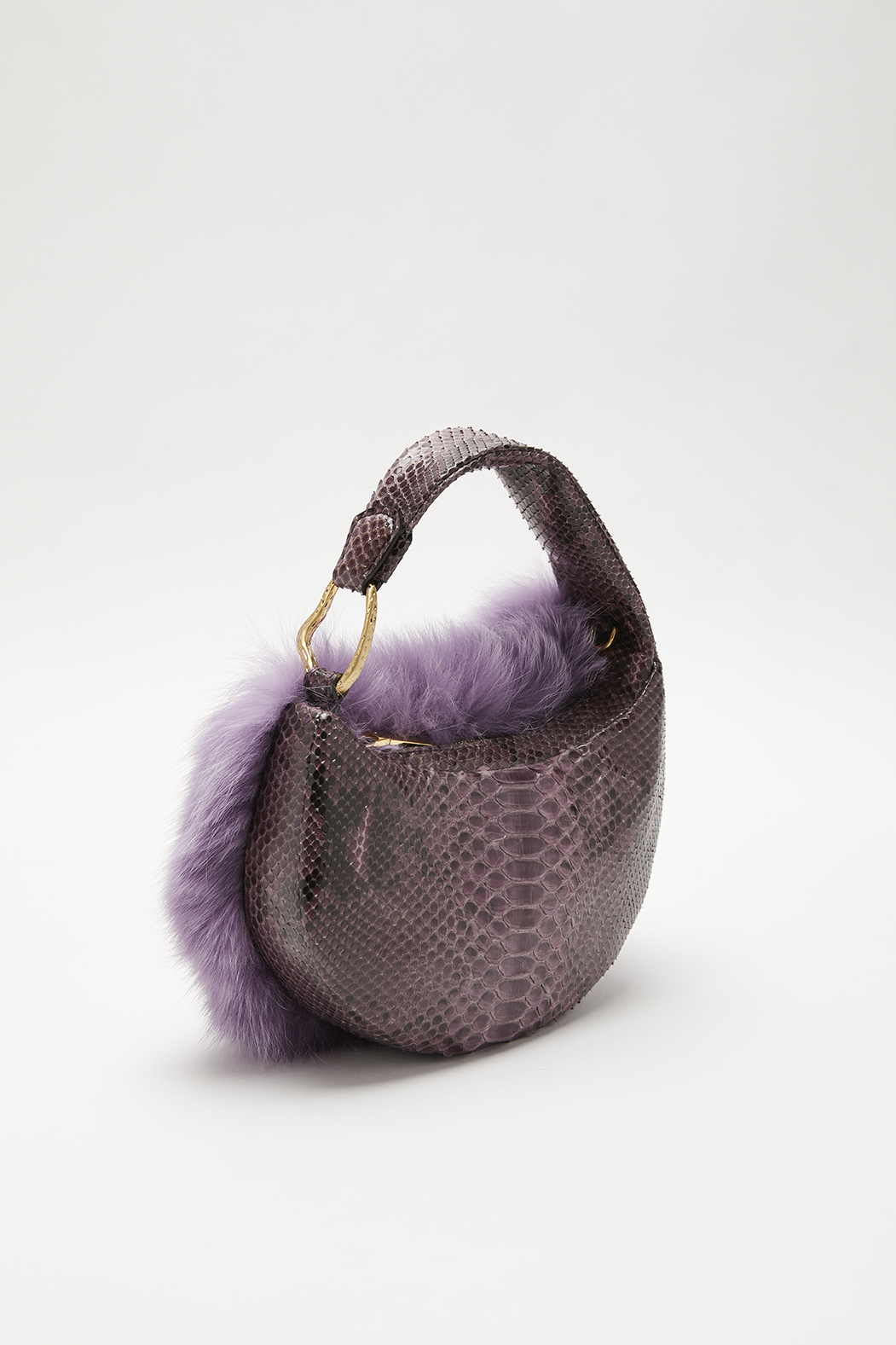 Túi đeo vai nhỏ bằng da trăn và lông cáo với phụ kiện bằng đồng vàng