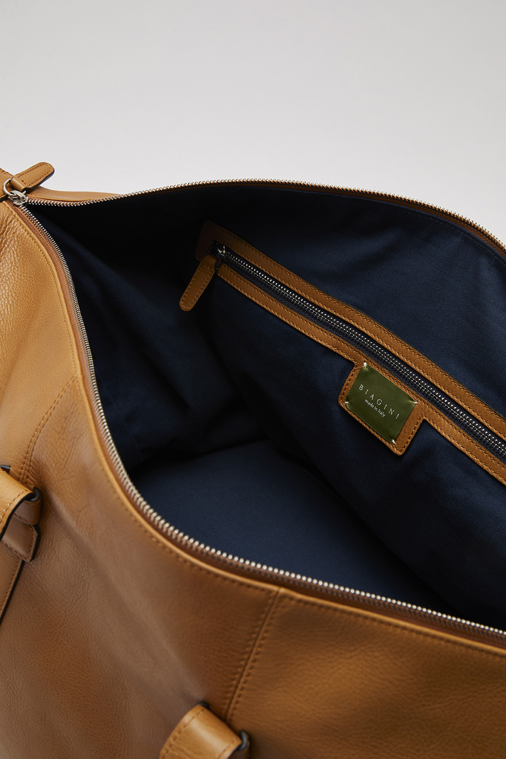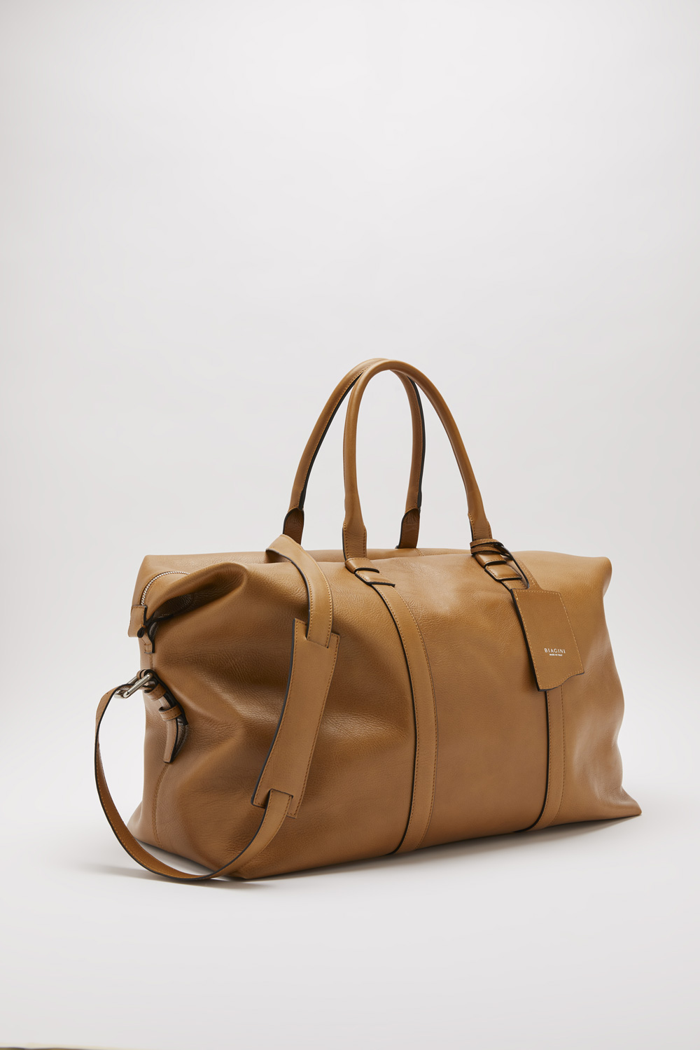 Túi du lịch da mềm in logo Biagini, bảng tên da và chi tiết kim loại
