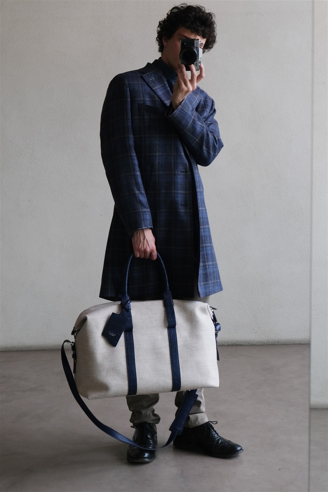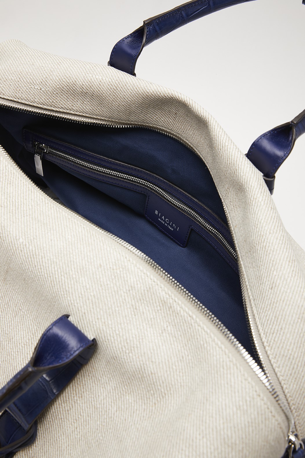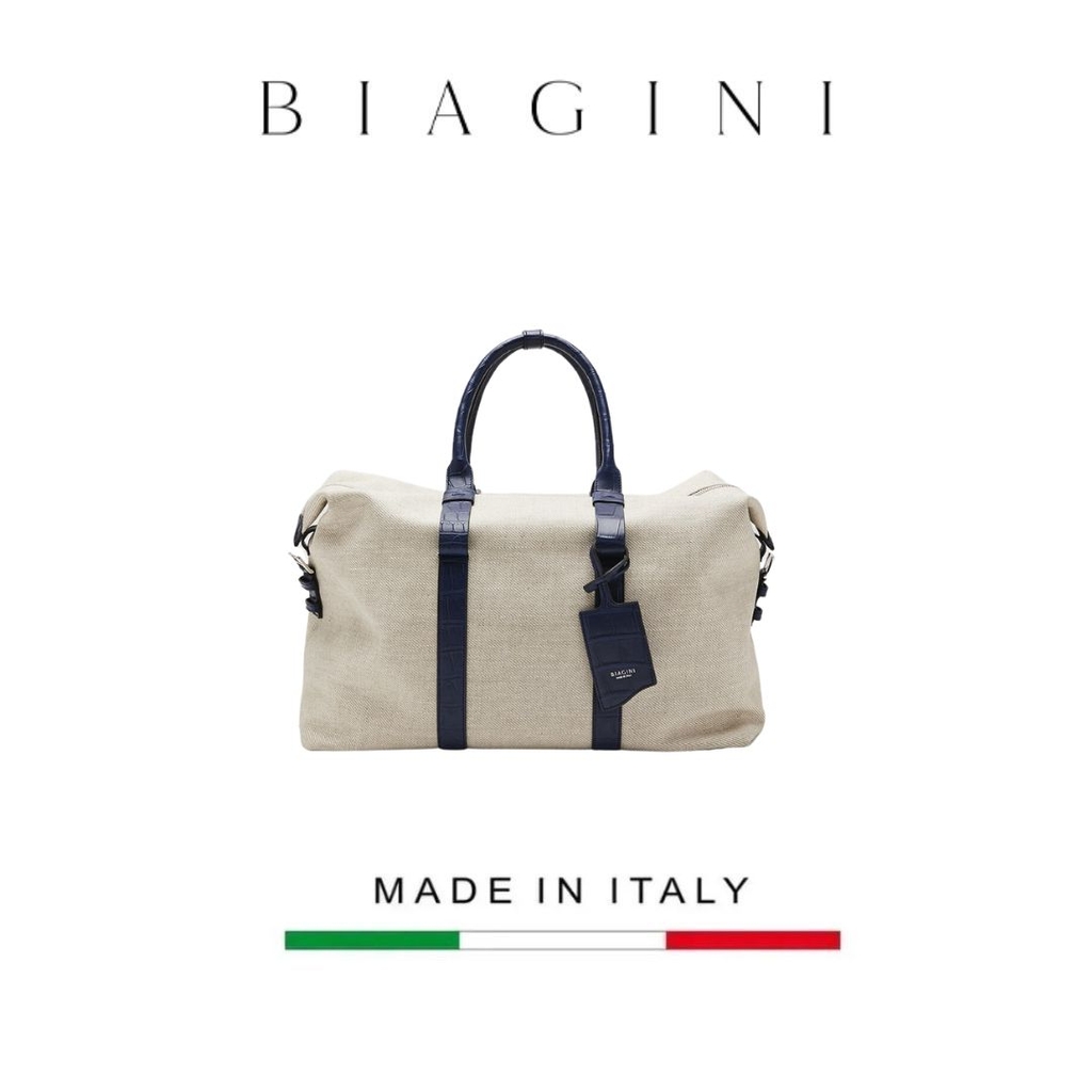 Túi du lịch bằng vải và cá sấu mềm có logo Biagini, bảng tên bằng da và chi tiết kim loại