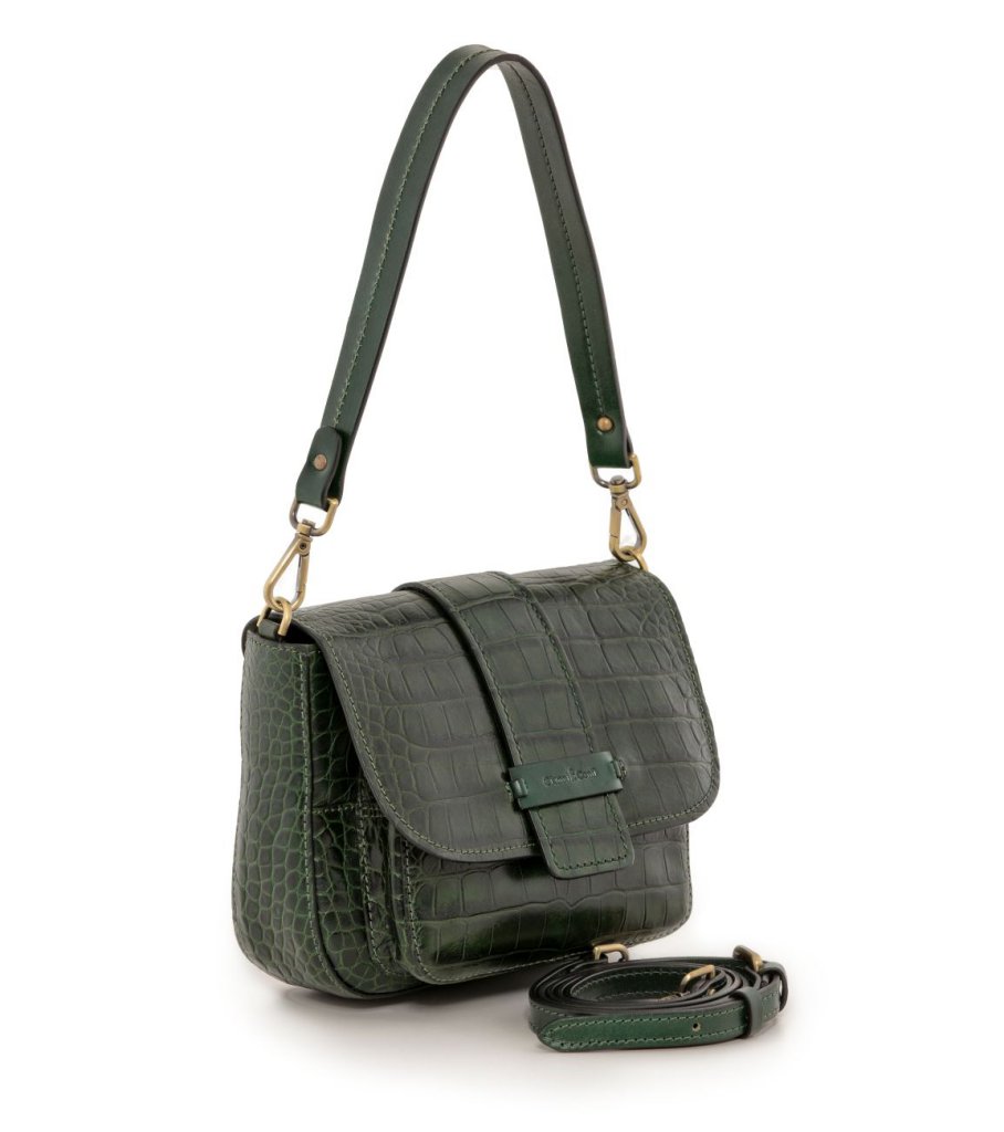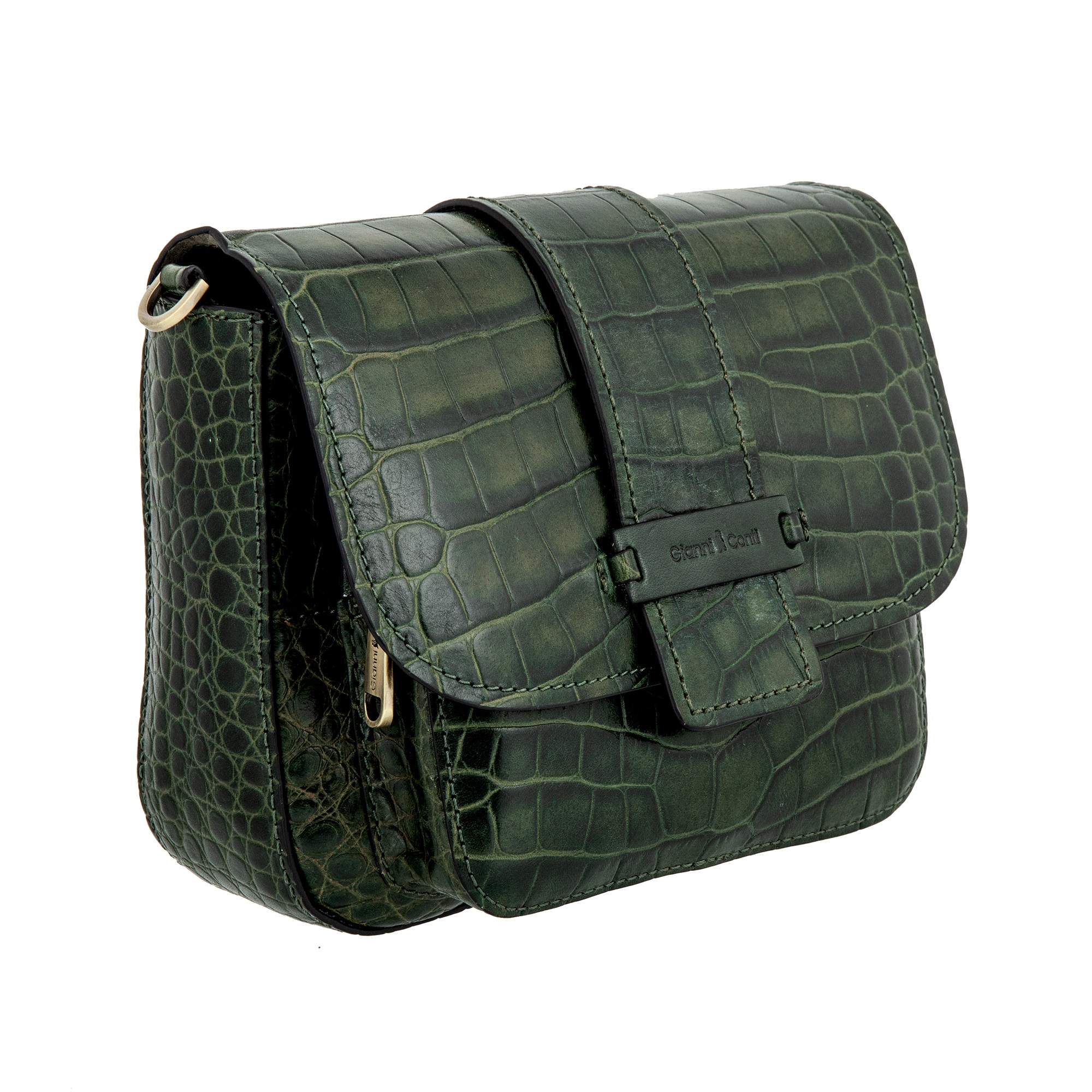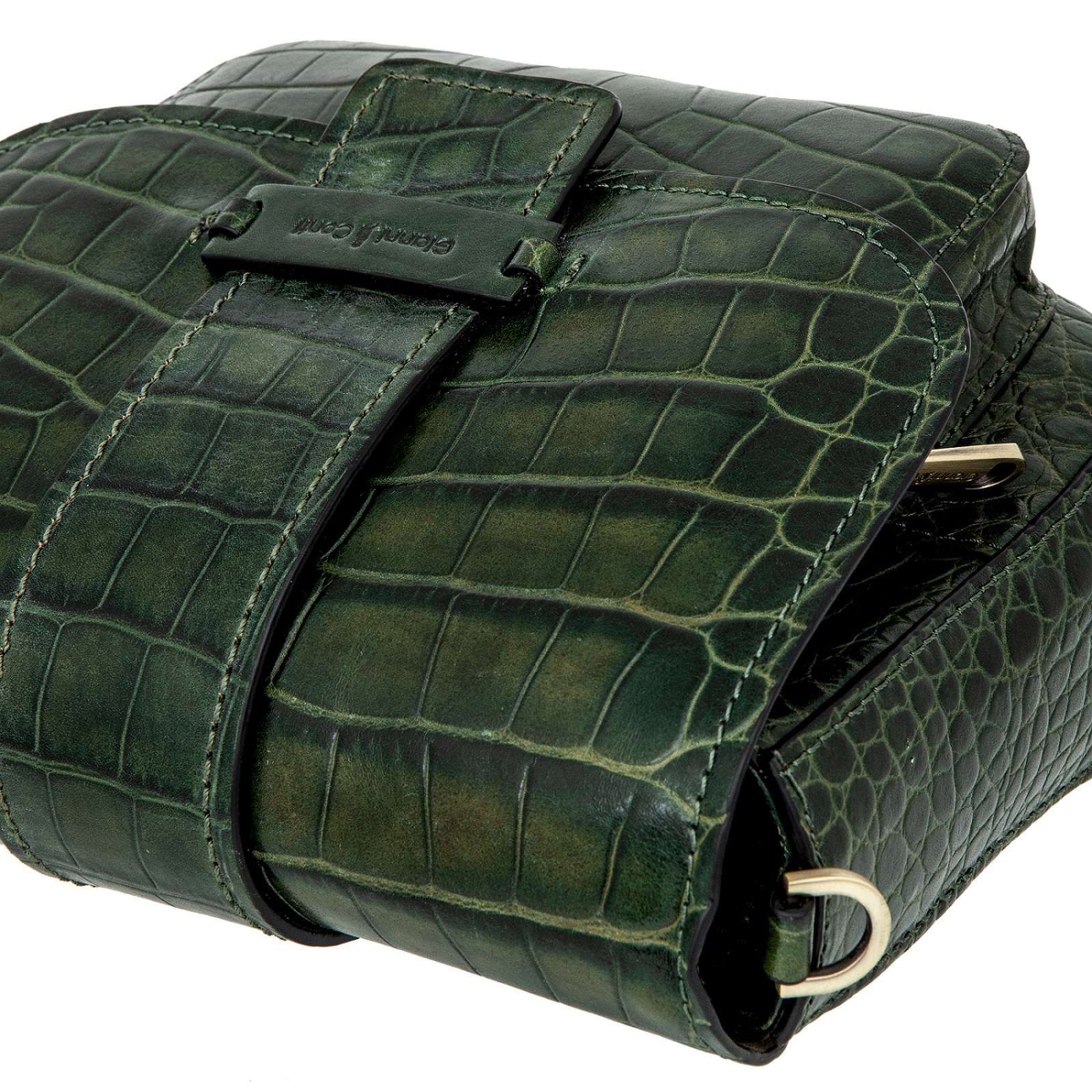 Chiếc túi xách nhỏ màu xanh lá cây bằng da với họa tiết da cá sấu dập nổi từ thương hiệu Ý Gianni Conti được làm từ loại da Vachetta thuộc da thực vật cao cấp nhất. Bên trong, có một ngăn chính, một ngăn có khóa kéo và một ngăn mở để đựng các vật dụng nhỏ. Phía trước, dưới nắp, có một ngăn có khóa kéo, và bên trong có một ngăn có khóa kéo. Túi có quai xách bằng da có thể tháo rời với móc khóa và dây đeo vai bằng da có thể tháo rời, điều chỉnh được với móc khóa, cho phép đeo túi trên vai hoặc đeo chéo. Phần cứng bằng đồng thau được đánh bóng. Một túi đựng bảo quản bụi được tặng kèm để bảo quản cẩn thận.