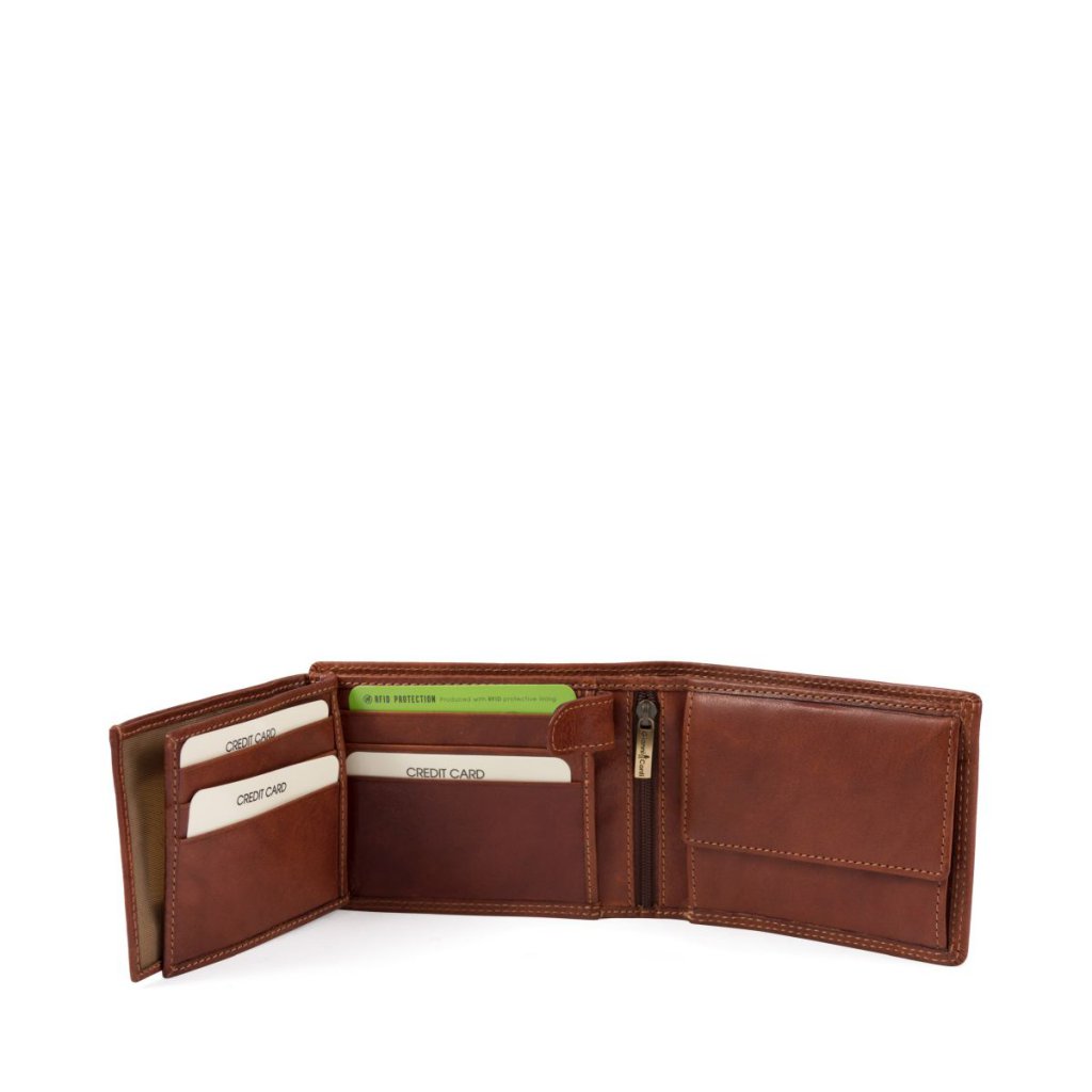 - Hai ngăn đựng tiền được viền da với một ví đựng tiền xu có nút bấm lớn hơn bình thường. Một khóa bấm giữ chặt hai ngăn đựng giấy tờ tùy thân và sáu khe cắm thẻ tín dụng.